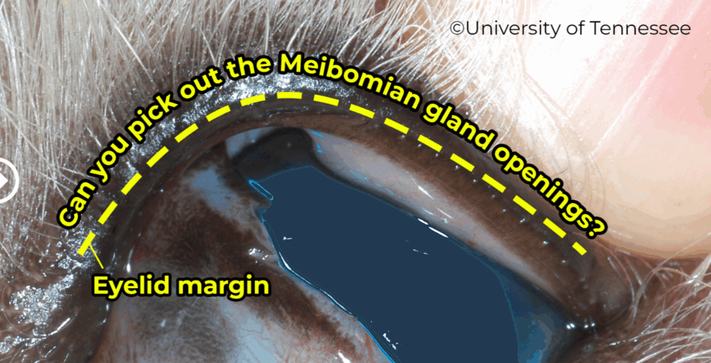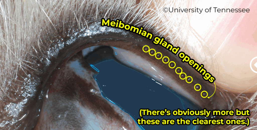 下の画像は犬の左上眼瞼のクローズアップですが、そこに存在するマイボーム腺の開口部が分かりますか?