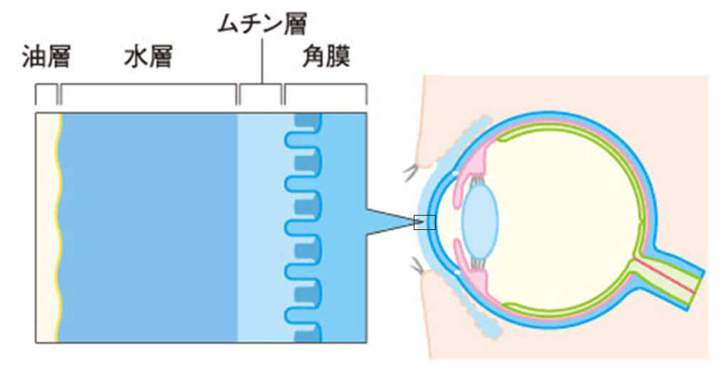角膜上皮はムチン層と呼ばれる粘液の層に覆われ、その上に涙腺で作られた涙(水)の層が乗っかり、さらにその表面を油層と呼ばれるマイボーム腺で作られた油分(脂質)が覆っているのです。単に涙と思っていたものが結構複雑なのですね。