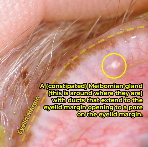 黄色の円の真ん中にあるのがマイボーム腺の開口部です。もちろん他にもありますが、最もわかりやすいのはこれらです。