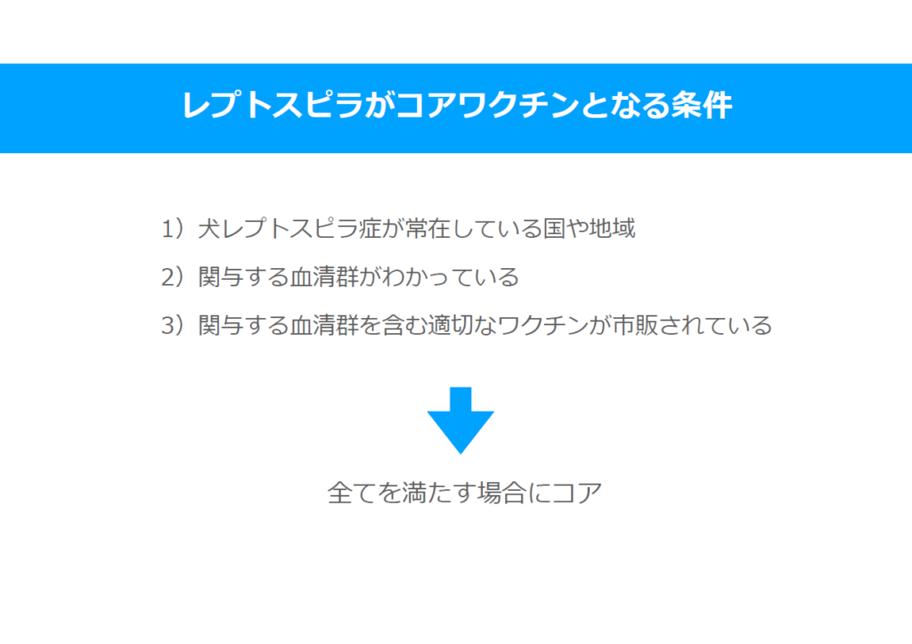ガイドラインにあるように、現在発生のある血清型のワクチンは確かにコアワクチンと言えますが、使用可能なレプトスピラのワクチンがコアワクチンとは限らないという、悩ましい状況であることをご理解いただけたと思います。