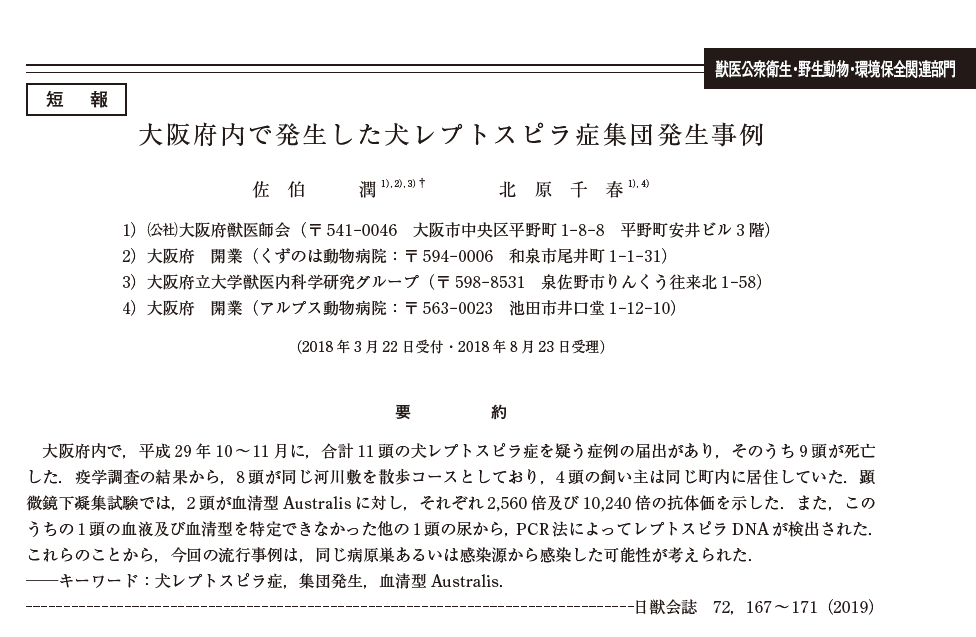 小泉らは、日本で飼育されている犬にレプトスピラ症が多く発生しており、その分離株は病原性が強く、血清型がこれまでのCanicola もしくはIcterohaemorrhagiae からHebdomadis に変遷してきていることを報告しました(2013年)。
