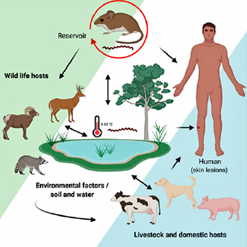 動物では、感染すると黄疸、出血及び腎不全等の症状を伴って急性経過を示す例と、感染してもほとんど症状を示さずに菌を排出し続ける例があります。また、数週間~数年にわたって尿中に菌を排出する例もみられます。人や犬は、野生げっ歯類等の保菌動物の尿によって汚染された水や土壌との直接的、間接的な接触により感染します。